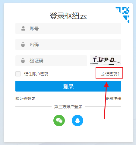 解决方法:打开枢纽云账户登录界面。下图中,点击“忘记密码”即可进入重置密码界面。