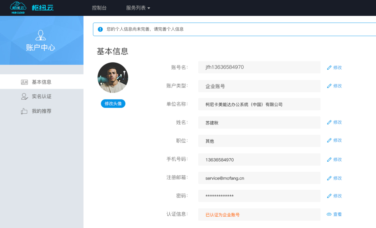 账号指真实的个人或企业登录云服务中心的账号信息,客户的基本资料都和客户的账号相关联。